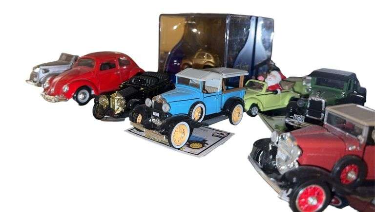 Assorted Chevrolet die-cast cars with description cards and certificates of authenticity (only 4). believed to be 1:43 scale. Also includes VW Beetle and Elgin mini clock in box. Located on second floor.