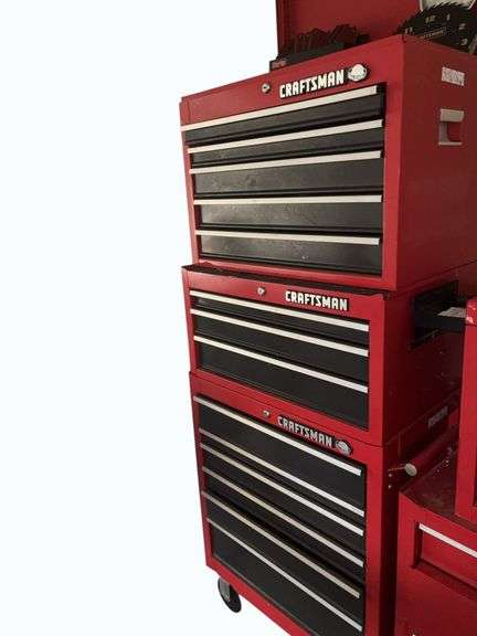 Top portion consists of top storage, and five drawers. Middle section consist of three drawers and side shelf. Bottom section consists of six drawers and handle for pulling. On casters. Located in garage.