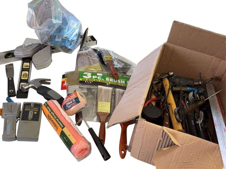 Stud finders, levels, hammer, measuring tapes, paint brushes, and more.