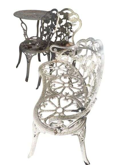 White wrought iron outdoor patio set. Shows wear and weathered. Needs to be cleaned. Located in backyard.
