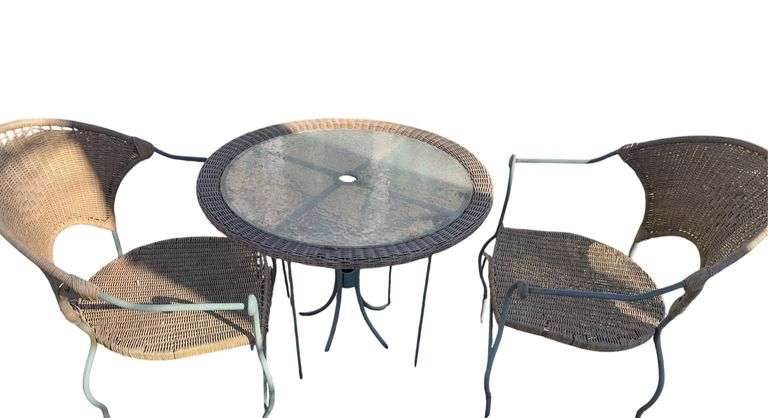 Metal and resin wicker outdoor table and chairs. Table has glass top with hole for umbrella. All overs show wear from outdoor elements. Need to be cleaned. Located in backyard.