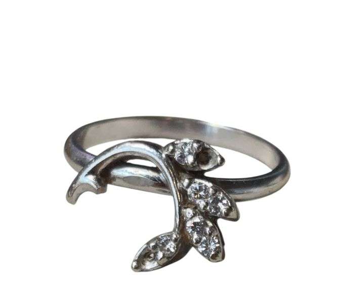 14 karat gold ring with C- shaped leaf design with diamond chips. Ring is bent. Marked 14KT. Diamonds tested positive. Setting is missing some diamond chips.