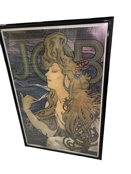 Advertising poster for Job cigarette papers, featuring a woman with stylized, flowing hair holding a smoking cigarette. In black plastic frame.