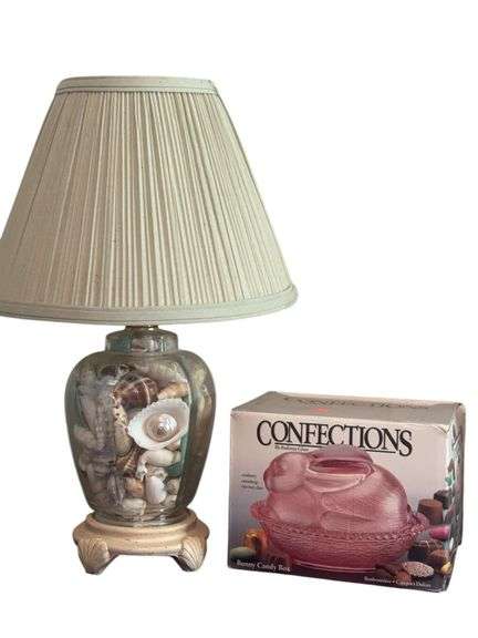 Table lamp with glass jar filled with seashells and an Indiana glass, cranberry bunny candy box. No visible chips or cracks. In original box.