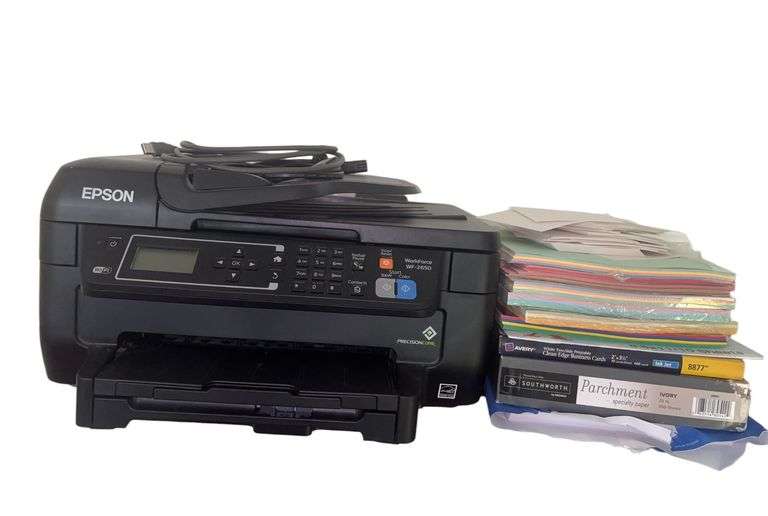 Epson workforce WF – 2650 all in one printer. Variety of colored paper, parchment paper, business card, and inkjet paper.