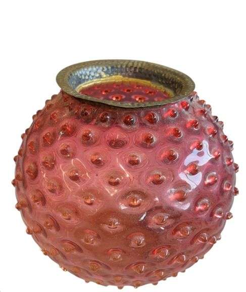 Believed to be late 1800's Hobbs Brockunier Co. rubina glass globe vase or rose bowl with a hobnail exterior and a starburst pattern on the underside. The color at the top is a rich cranberry and shades lighter as it descends to an orange or yellow at the very bottom.