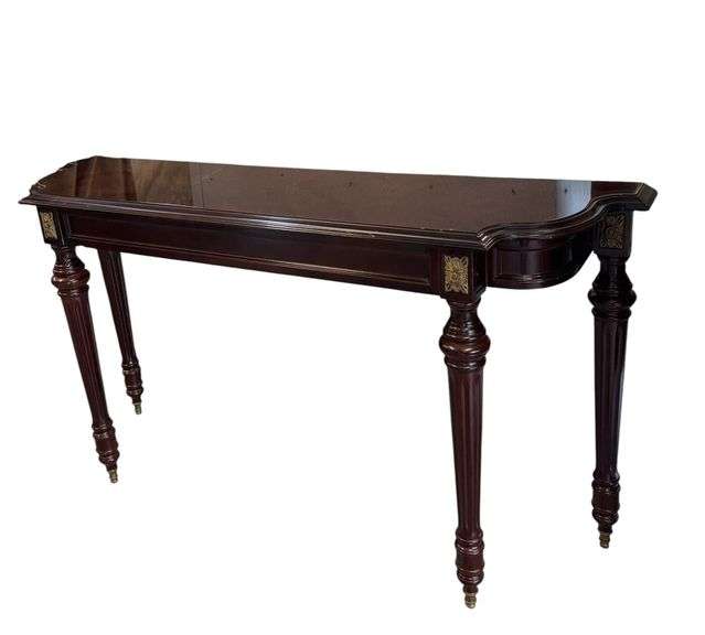 Dark brown with scalloped side, reed legs with brass caps. Table is wobbly and does not sit flat. Carries residual smoke odor from prior environment.