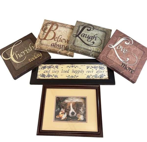 Cherish, Believe, Laugh and Love wrapped canvas, wood wall decor, and a framed matted dog picture.