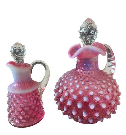 Two hobnail cranberry white cruets. Top on bigger one will not come off. No visible chips or cracks.