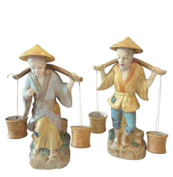 A couple carrying water buckets, in traditional attire and conical straw hats. No visible chips or cracks.