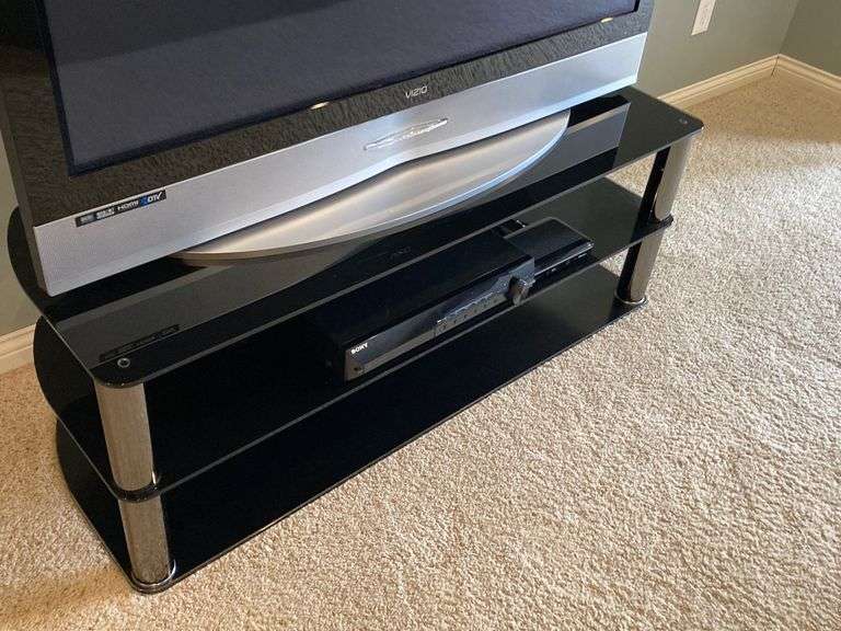 Black and silver TV stand with two shelves. Contents not included. Located in the basement. Believed to be glass shelves.